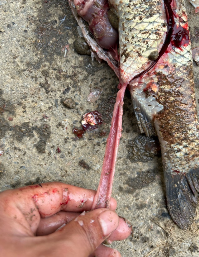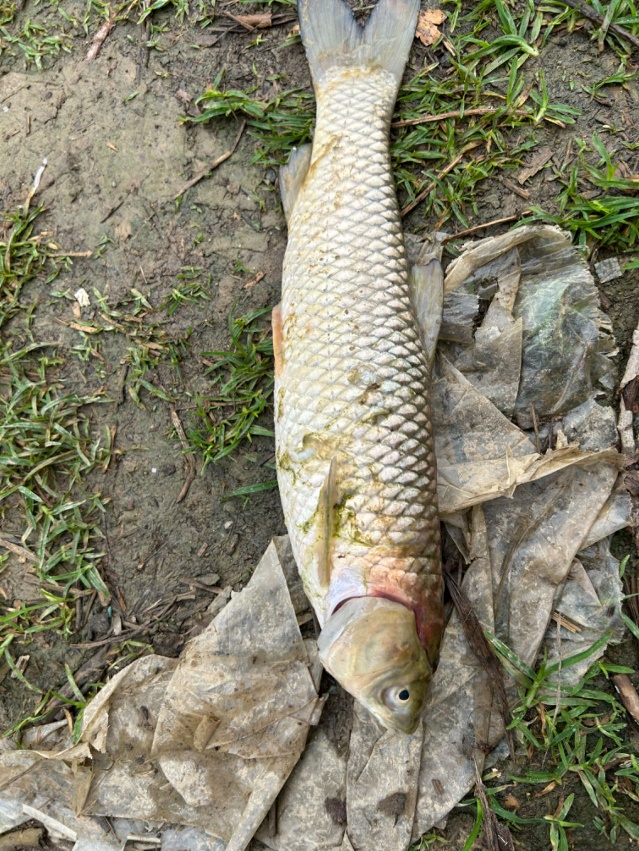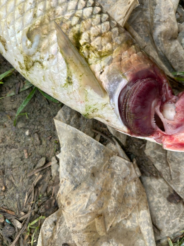5月10日-5月12日发现草鱼池有轻微死亡,平均规格1斤左右,每天死亡量在10条左右,显微镜观察鳃丝无寄生虫,轻微烂鳃,病鱼肛门红肿,解剖发现内脏有腹水,肠道充血发红