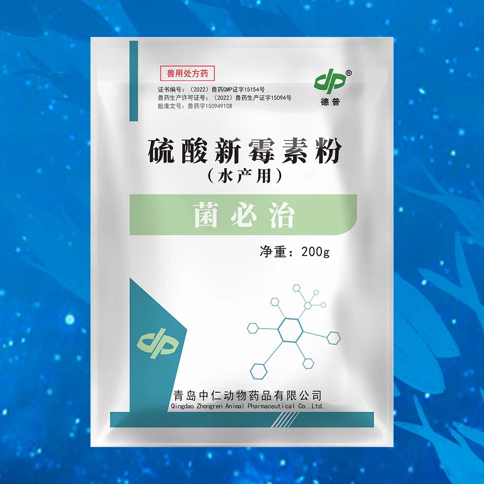 内服:同时拌料内服氟苯尼考(2000-2500斤鱼/包)+硫酸新霉素(2500-3000斤鱼/包)+肝胆康泰(2500-3000斤鱼/包)+水产专用多维(6000-8000斤鱼/包),一天一顿,连续拌料内服5-7天。