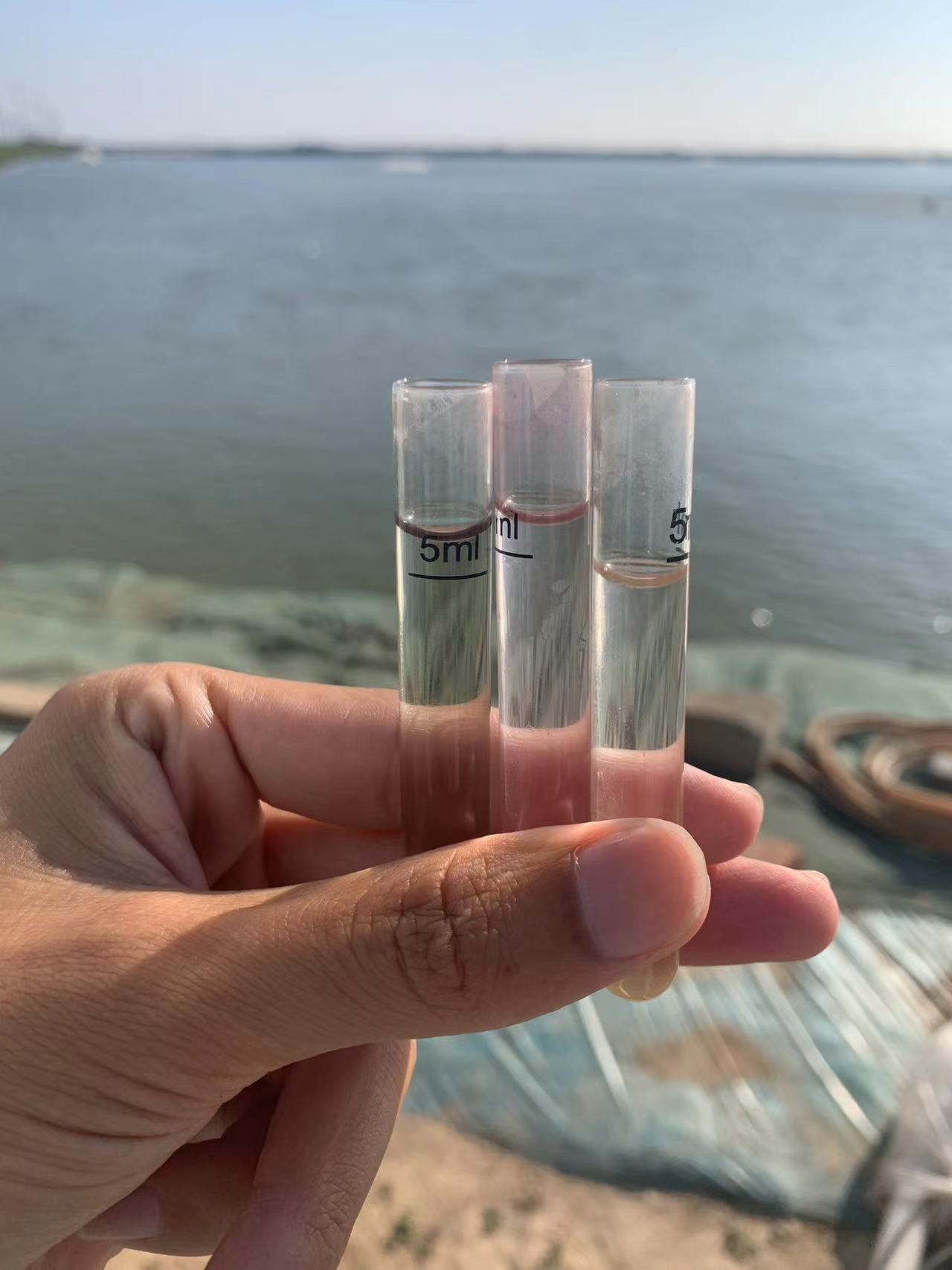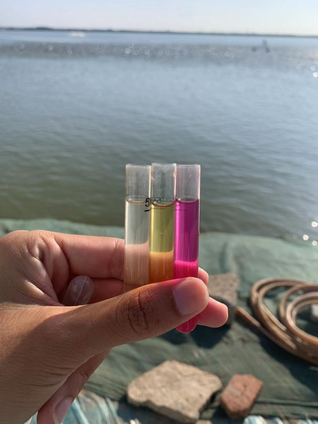 肥水两天后,池塘水色由浑浊转为嫩绿色,早上鱼虾浮头现象消失,鲤鱼吃料明显好转。经测量亚盐由0.6降低到0.2,pH上升至8.6。四天后亚盐降为0.05。