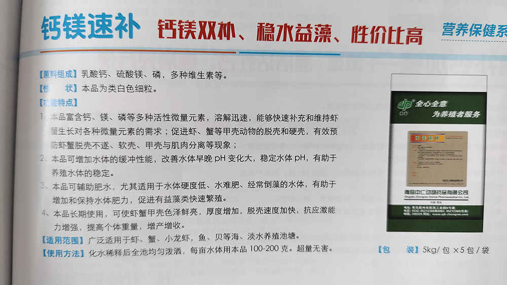 钙镁是虾生长发育必需的矿物质,是其甲壳形成的重要元素。缺钙虾体易软壳,缺镁不利于饲料的吸收,虾生长受阻。