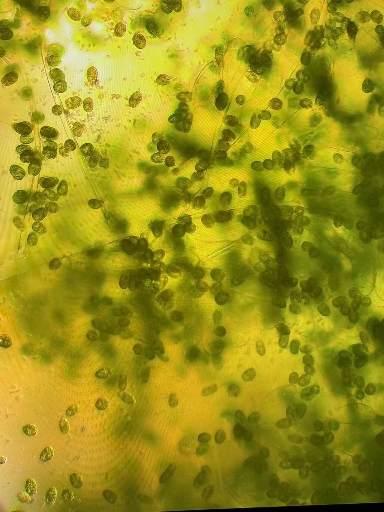 使用中仁酵素肥(每桶10亩/米)+超级藻种(每瓶3亩/米)全池泼洒,晴天上午使用,3~5天后可再次追肥一次,傍晚使用速补多矿(每袋3~5亩/米)全池泼洒让虾苗充分吸收,促进其脱壳。隔天可使用分解底改(每袋10亩)全池改底。随后镜检,柄裸藻脱落消失,效果显著。
