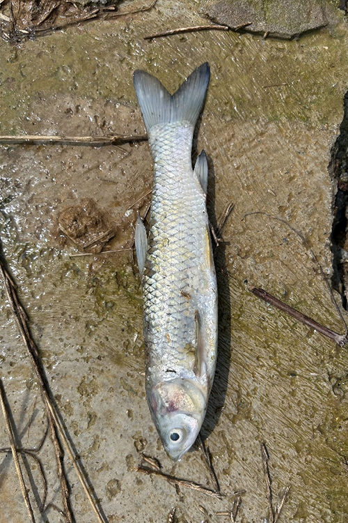 从6月初开始长期阴雨天,草鱼慢慢开始出现死亡,持续到6月中旬,高峰期为每天死亡三四十条草鱼。死亡的草鱼鳃盖鳍条基部处有轻微发红出血,烂鳃,镜检无寄生虫。内脏解剖有腹水伴随肠炎,肝脏发黑。同时鱼塘水面下风口有一层蓝藻,油膜泡泡等。