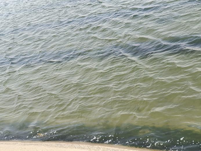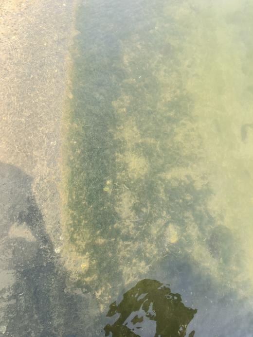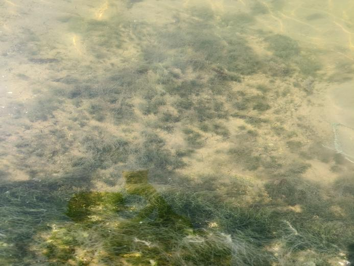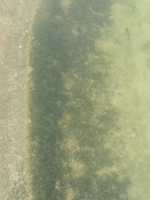 第一天:来到养殖池塘,发现在海参礁以及岸边有大量绿管菜,随后养殖户使用24包“苔藻克星”化水全池泼洒。