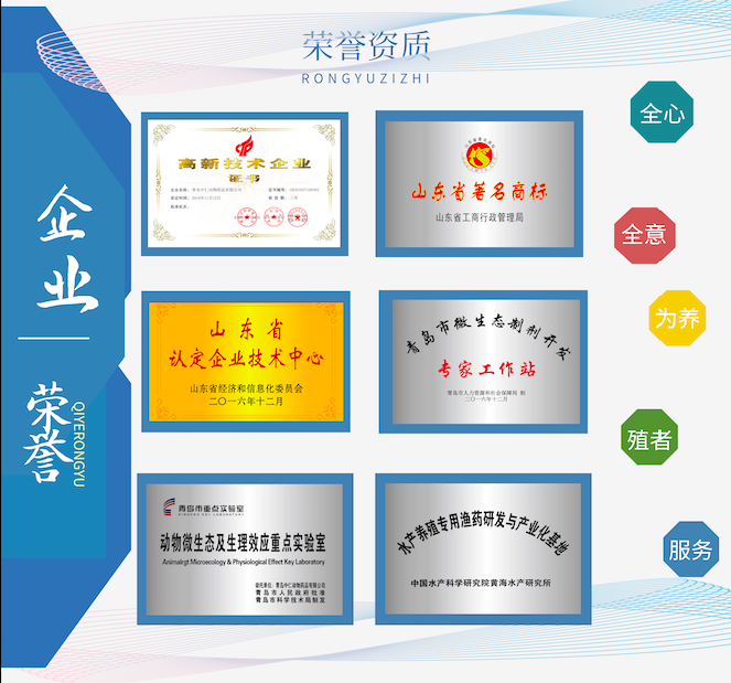 公司研发中心被认定为“青岛市企业技术中心”、“青岛市渔药工程技术研究中心”、“山东省渔药工程技术研究中心”、公司微生态实验室被认定为“青岛市动物微生态及生理效应重点实验室”,公司被评为青岛市守合同重信用企业,被山东省畜牧协会授予“讲诚信 创名优先进单位”,被国家发改委评为全国动物保健品行业百强企业。